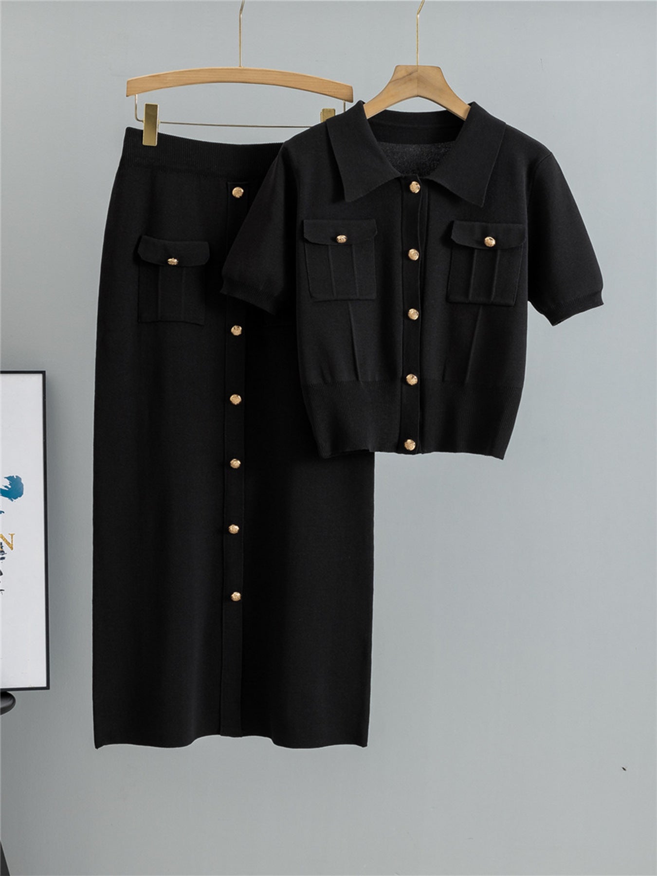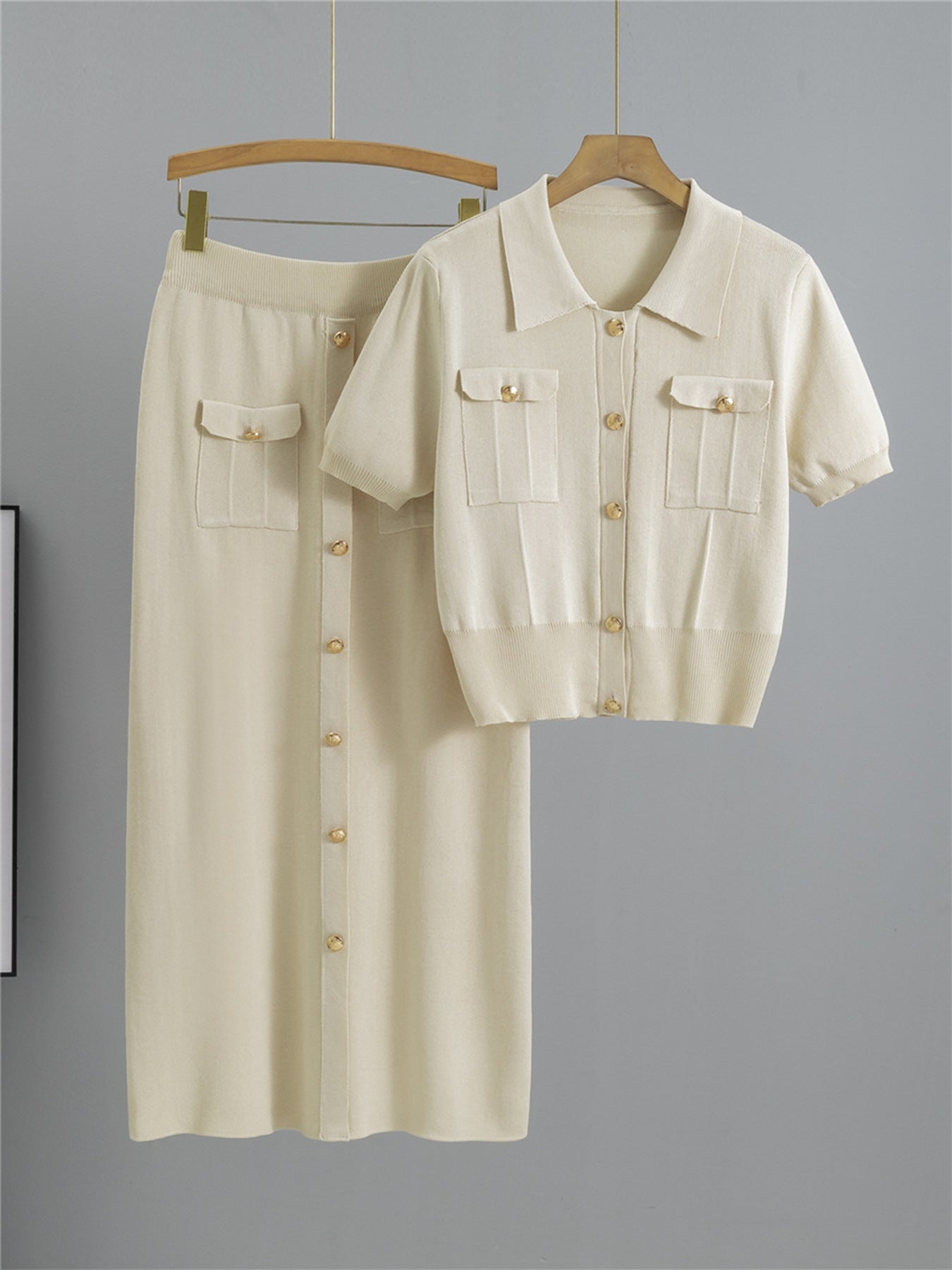 - Knitted Skirt: A matching high-waisted, midi-length skirt with a button-down front. The A-line silhouette offers a flattering fit, emphasizing the waistline while providing comfort.