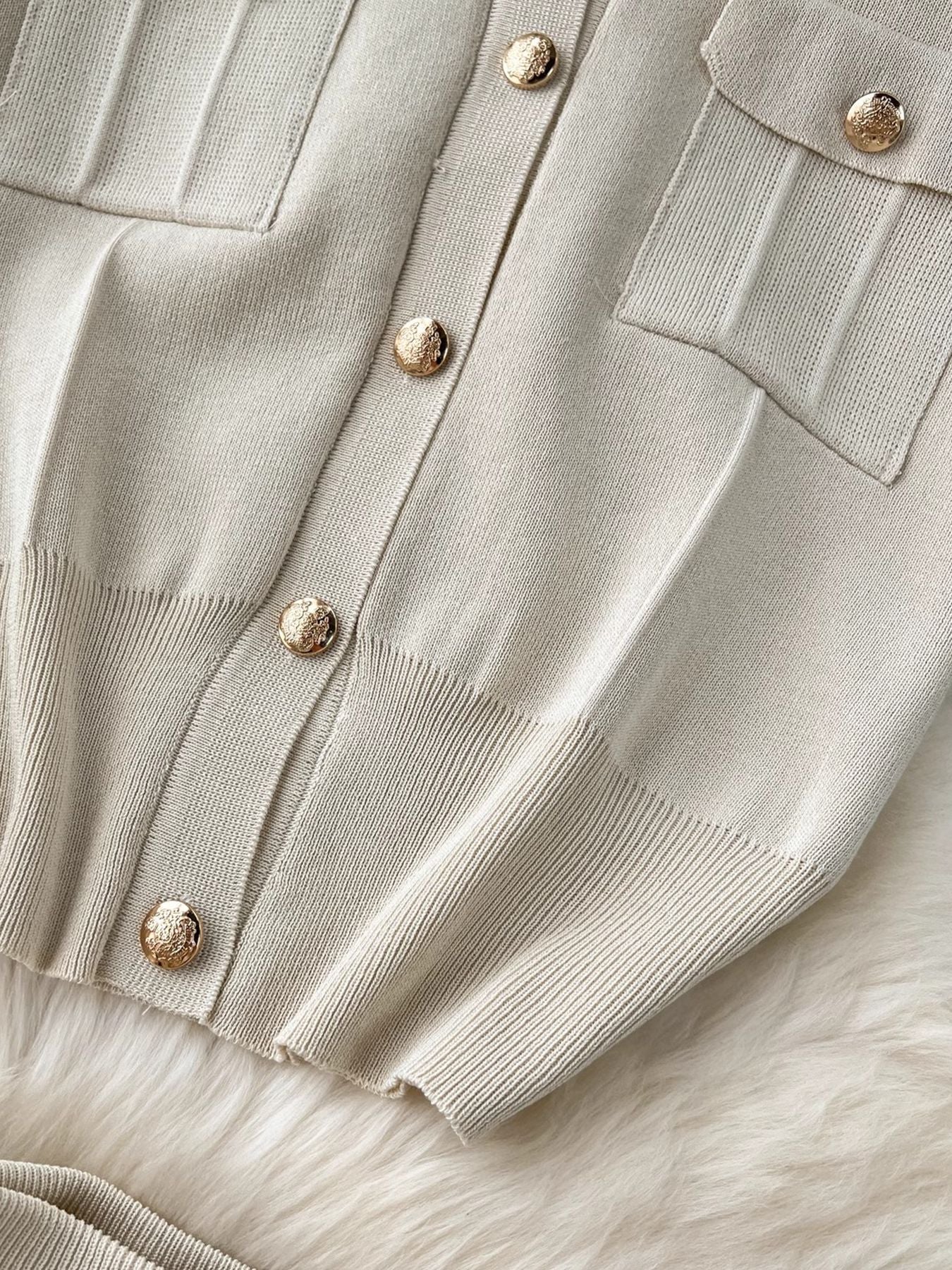 - Knitted Top: A short-sleeve cardigan with a turn-down collar and a button-down front. It is designed with two decorative pockets on the chest, adding a classic touch.
